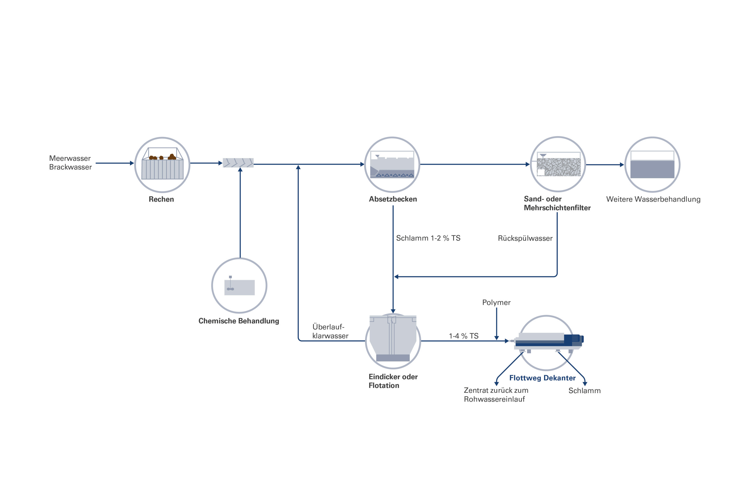 Sedimente aus der Vorbehandlung werden zusammen mit dem Filterrückwaschwasser in Sedimentationsbecken geleitet, in denen die weiteren Prozessschritte erfolgen. Der Schlamm mit einem Feststoffgehalt (TS) von 0,5 bis 2 % wird zu Eindickern oder Flotationsanlagen geleitet, wobei das Überlaufwasser in die Rohwasserentnahmestelle der Anlage zurückgeführt wird.
