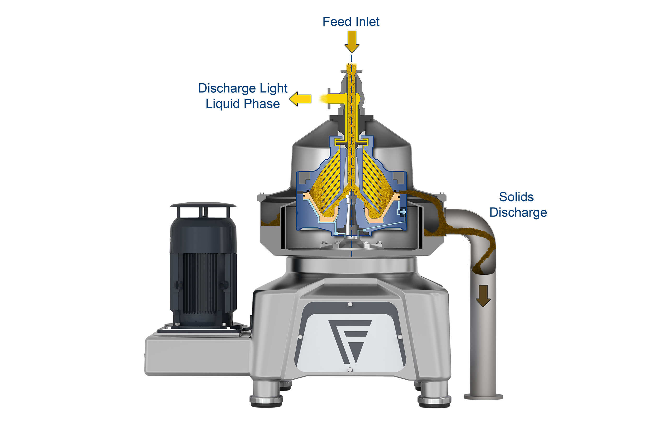 Los sólidos recogidos son descargados periódicamente por un sistema hidráulico situado en el fondo del recipiente sin interrumpir el funcionamiento. La fase líquida clarificada es extraída continuamente mediante una bomba centrípeta y descargada a presión para su posterior procesamiento.