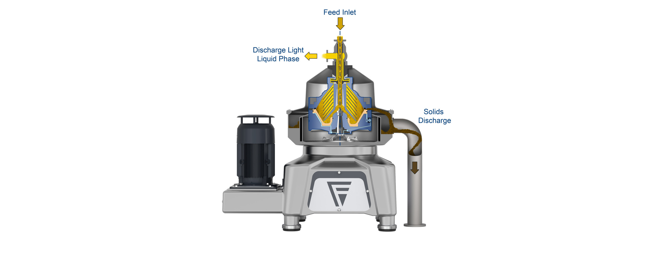 El producto que se va a separar se introduce en el tambor giratorio a través de un tubo de alimentación central. Un distribuidor situado en el interior de la máquina distribuye uniformemente el líquido entrante y lo acelera suavemente hasta alcanzar la velocidad máxima de funcionamiento del tambor, lo que garantiza un manejo controlado del producto con un bajo nivel de cizallamiento.