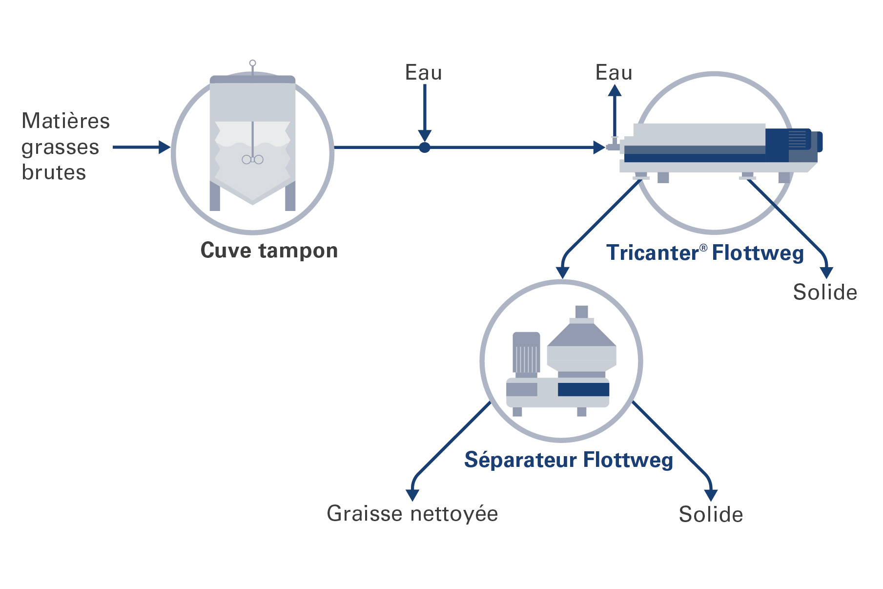 Le Tricanter® Flottweg sépare l’eau, l’huile et les particules solides en une seule opération. De part sa conception robuste, la centrifugeuse permet de séparer de manière optimale différents type de particules solides (tailles et quantités variables) .