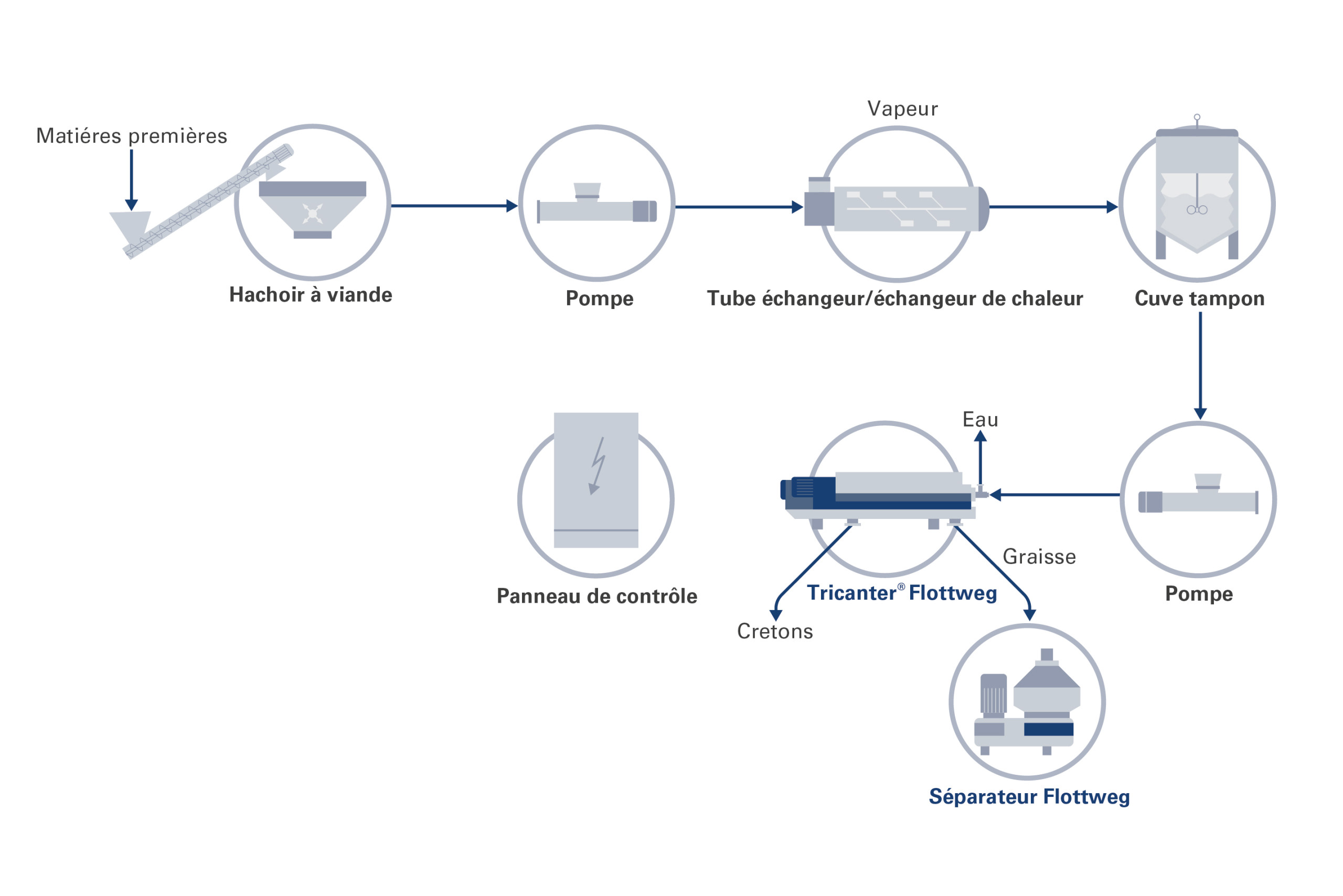 Flottweg est le leader mondial dans le secteur des centrifugeuses industrielles pour la séparation solide-liquide et donc depuis des décennies un partenaire de confiance de l'industrie de la viande. Le respect des réglementations légales, des procédés irréprochables en termes d'hygiène et la protection de l'environnement sont une évidence pour nous.
