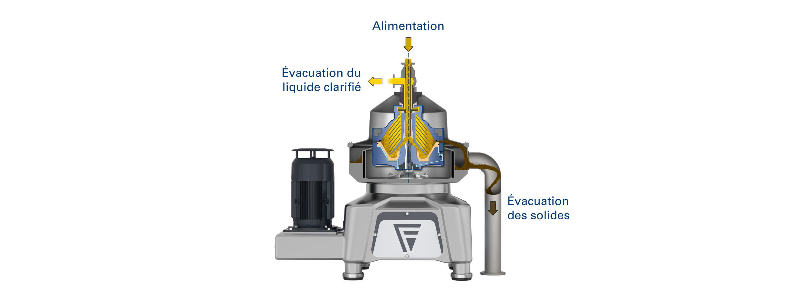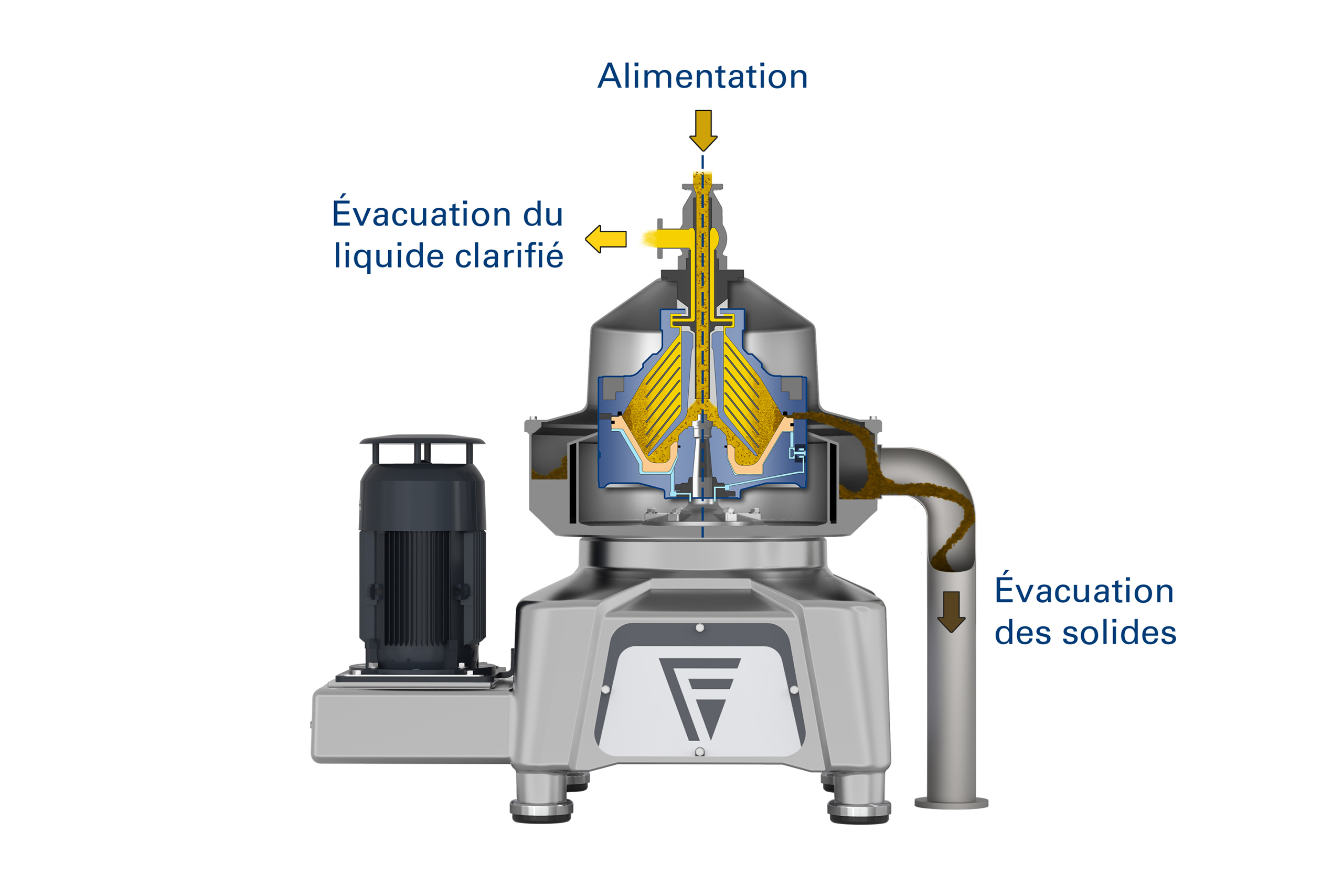 Les solides collectés sont évacués périodiquement par un système hydraulique situé au fond du bol sans interrompre le fonctionnement. La phase liquide clarifiée est évacuée en continu par une pompe centripète et refoulée sous pression pour un traitement ultérieur.