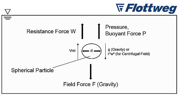 Le poids FG (Field Force, Gravity) s’oppose à la force de traction FA (Buoyant Force) et à la résistance FW. Peu importe que la densité de la particule soit plus grande ou plus petite que le milieu l’entourant, la vitesse de traction ou de descente Vg de la particule est constante.