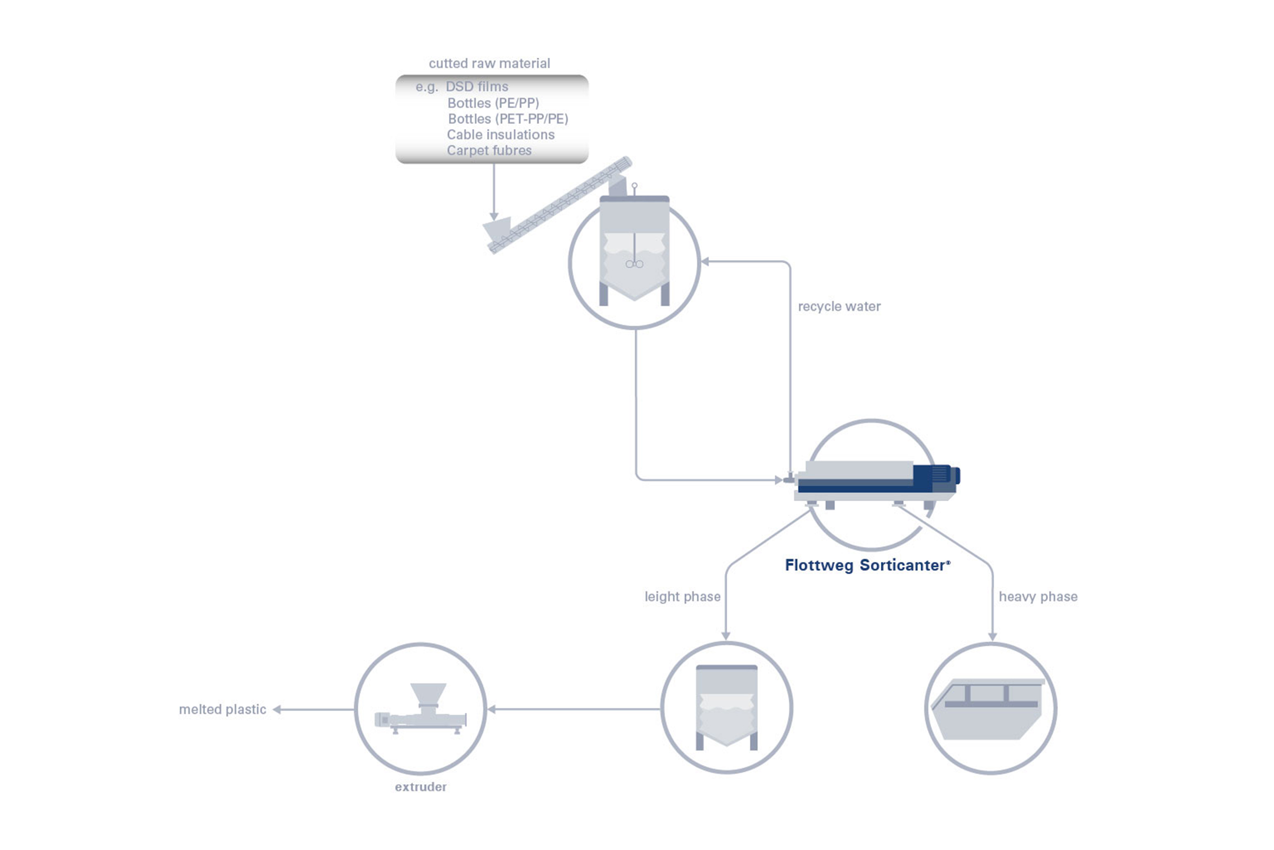 Flottweg Sorticanter® brevettato esegue un riciclaggio economico tramite la separazione di vari tipi di plastica a causa della loro diversa densità.