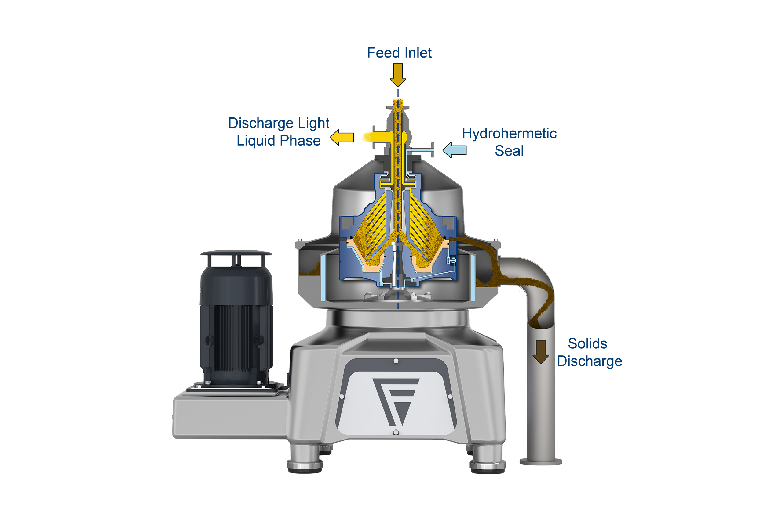 Il solido separato viene espulso periodicamente attraverso un sistema idraulico posto nella parte inferiore del tamburo. Tale operazione richiede che la macchina funzioni al massimo numero di giri. Il liquido chiarificato fluisce dal pacco dischi verso una pompa centripeta, dalla quale viene scaricato sotto pressione.
