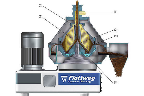 Faza stała napiera na zewnątrz i zbiera się w tak zwanej przestrzeni fazy stałej (4). Oddzielone fazy ciekłe przepływają przez pakiet talerzy do górnej części bębna i przepływają tam przez tarczę skórującą (zabierak) lub stałą płytę spiętrzającą (5). Zastosowana konfiguracja zależy od obszaru zastosowania.