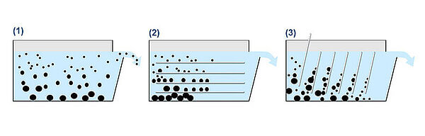Działanie wirówki talerzowej opiera się na podstawowej zasadzie sedymentacji. W mieszance ciało stałe-ciecz ciężkie fazy stałe gromadzą się na dnie zbiornika. Opadają one na skutek siły grawitacyjnej. (1) W ciągłym systemie oddzielania mieszanek ciało stałe-ciecz nie wszystkie cząstki fazy stałej mają wystarczająco dużo czasu, aby osiąść na dnie. Opuszczają one system ponownie razem z fazą ciekłą. Oddzielanie nie jest kompletne. Aby temu zapobiec, stosuje się kilka komponentów płytkowych w kształcie listew lub talerzy. (2) Rzeczywista separacja odbywa się w przestrzeni między pakietem talerzy. W przypadku większej liczby listew lub talerzy powierzchnia oczyszczania jest większa. Aby zapobiec blokadzie płyt lub talerzy dna nie są montowane poziomo, ale pod skosem. Cząstki fazy stałej ześlizgują się na dno. (3)