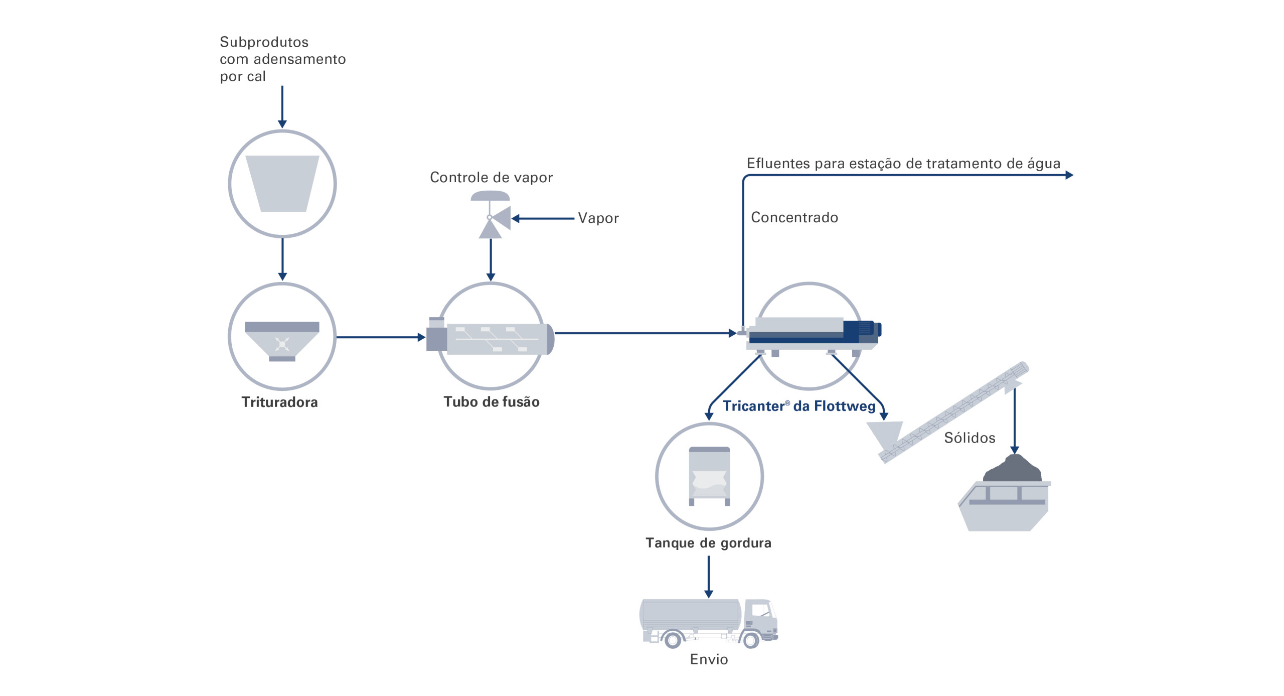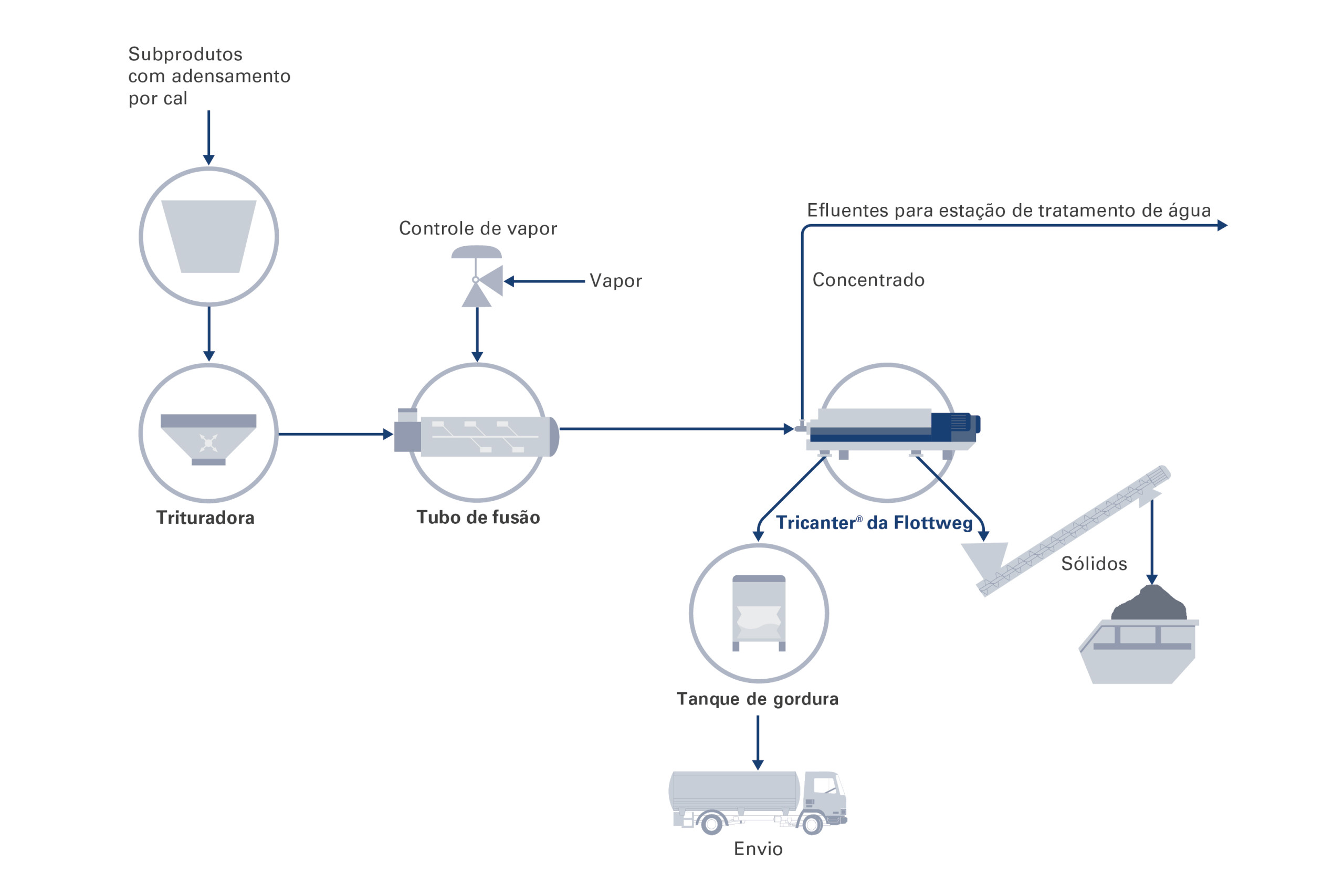 Há mais de vinte anos, a Flottweg realizou os primeiros testes com o Tricanter® para o processamento de subprodutos do descarne após a calagem. Desde então, foi desenvolvido um processo confiável, eficiente e bem-sucedido. Assim, foi possível reduzir os custos de destinação e, ao mesmo tempo, lucrar com a recuperação de gordura.